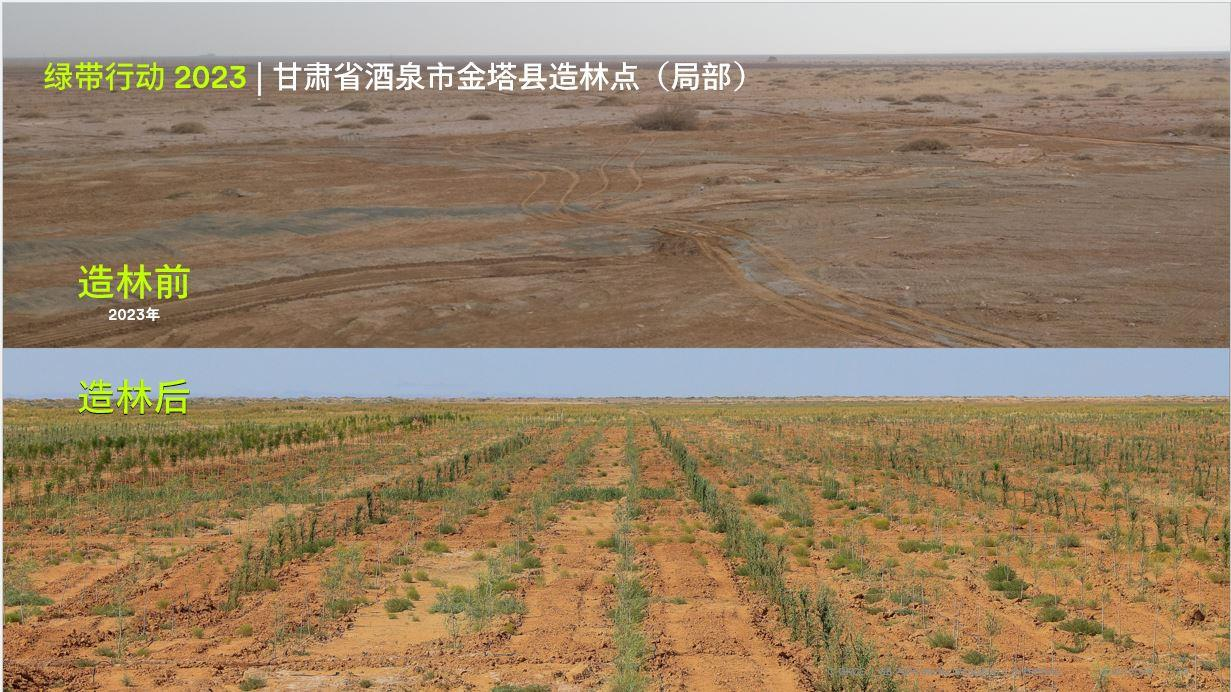 In 2023, the GREEN BELT project was implemented at a key windbreak and sand-control site in Jinta County, Jiuquan, Gansu Province. This site, located on the edge of the Badain Jaran Desert—one of China’s eight major deserts—is the source and intensification zone for 75% of sandstorms in Jiuquan, which have long affected the local living environment and constrained economic development. The project planted 850,000 locally suitable species, including Euphrates poplar, Russian olive, saxaul, and nitre bush, achieving 4 million square meters of afforestation and desertification control. It effectively supported local targeted control efforts, protecting surrounding farmland and the Heihe River basin from desertification. This initiative directly benefited 120,000 local residents and an additional 20,000 residents downstream along the river, while indirectly benefiting over 1.3 million residents in Jiuquan and Jiayuguan who are persistently affected by sandstorms. During the afforestation period, the project created 4,800 workdays, generating RMB 720,000 in additional income for participating low-income communities.